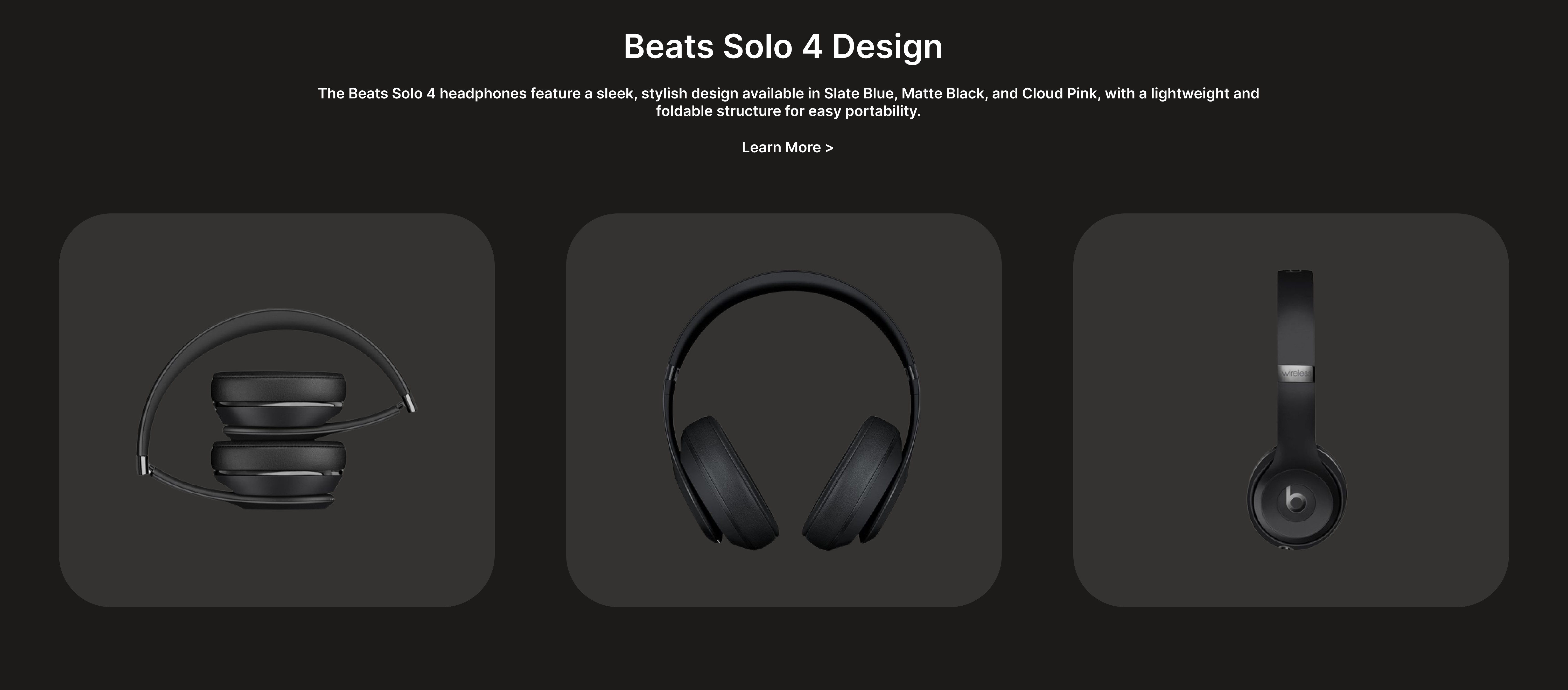The Beats Solo 4 landing page was designed as a sleek, premium product page to showcase the new generation of Beats wireless headphones. The goal was to visually represent the headphone’s modern aesthetic, highlight its key features, and drive users to purchase through an engaging layout and clear calls to action.