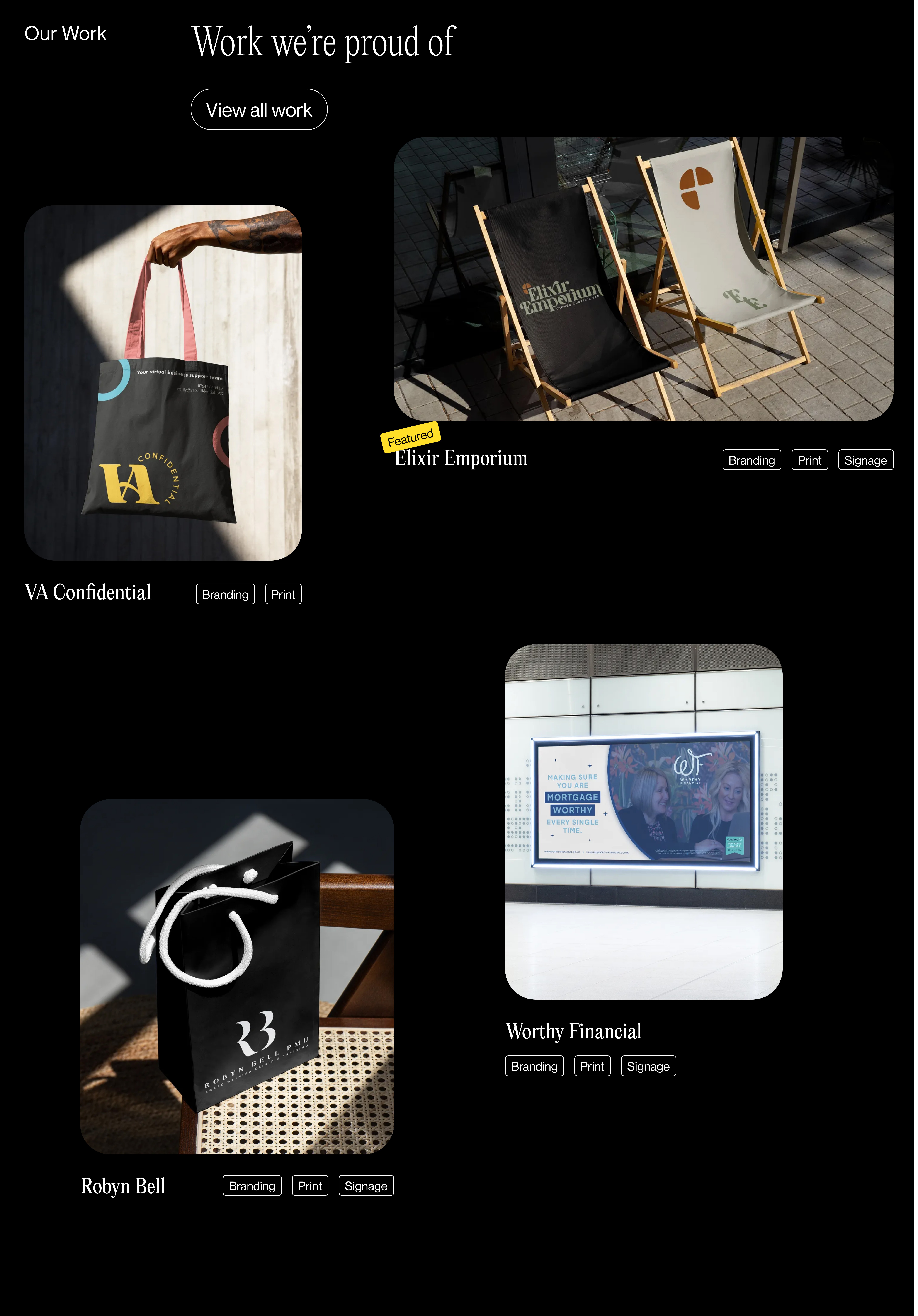 Featured projects with bold visuals (tote bag, outdoor branding, packaging, print media).