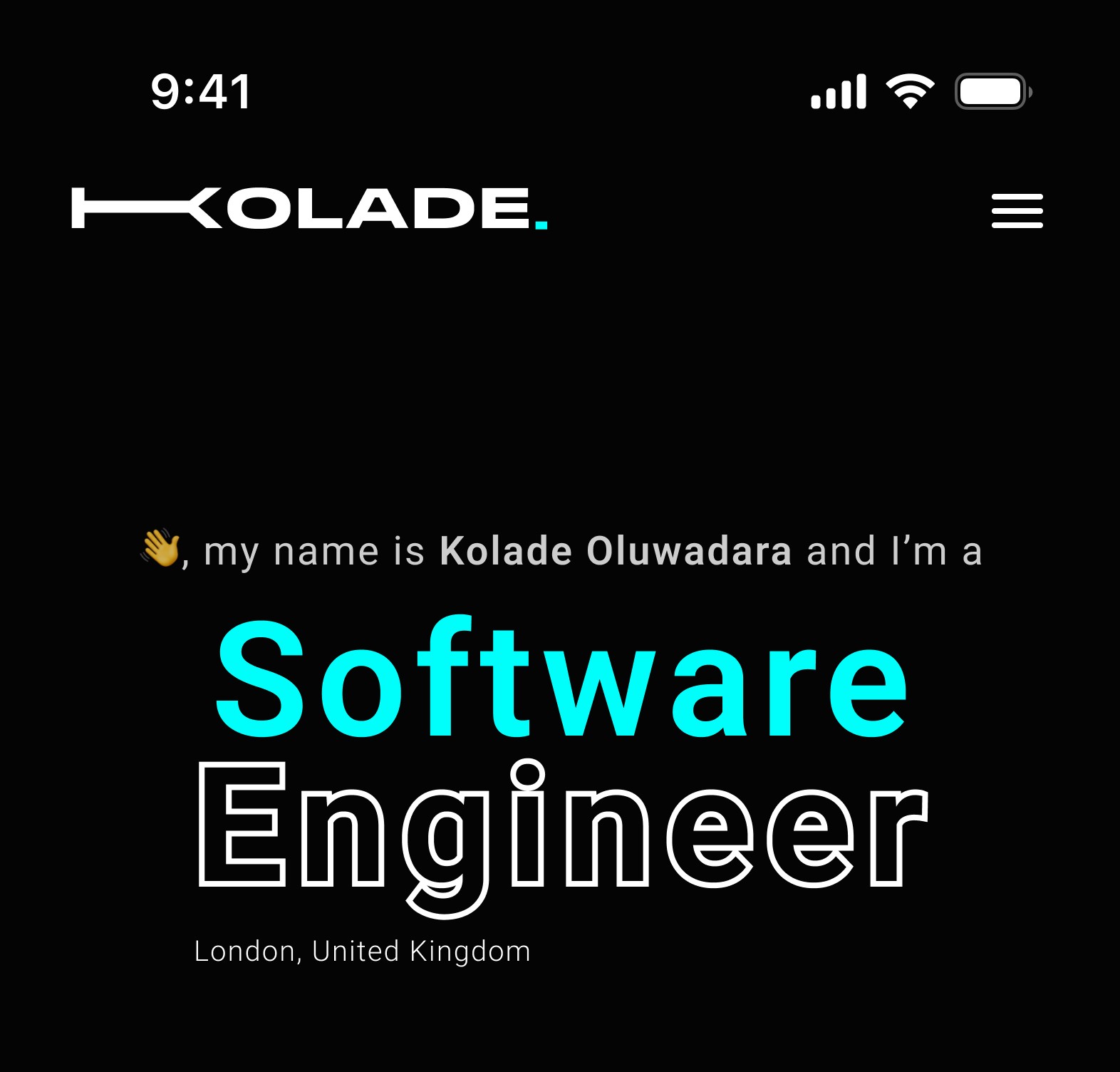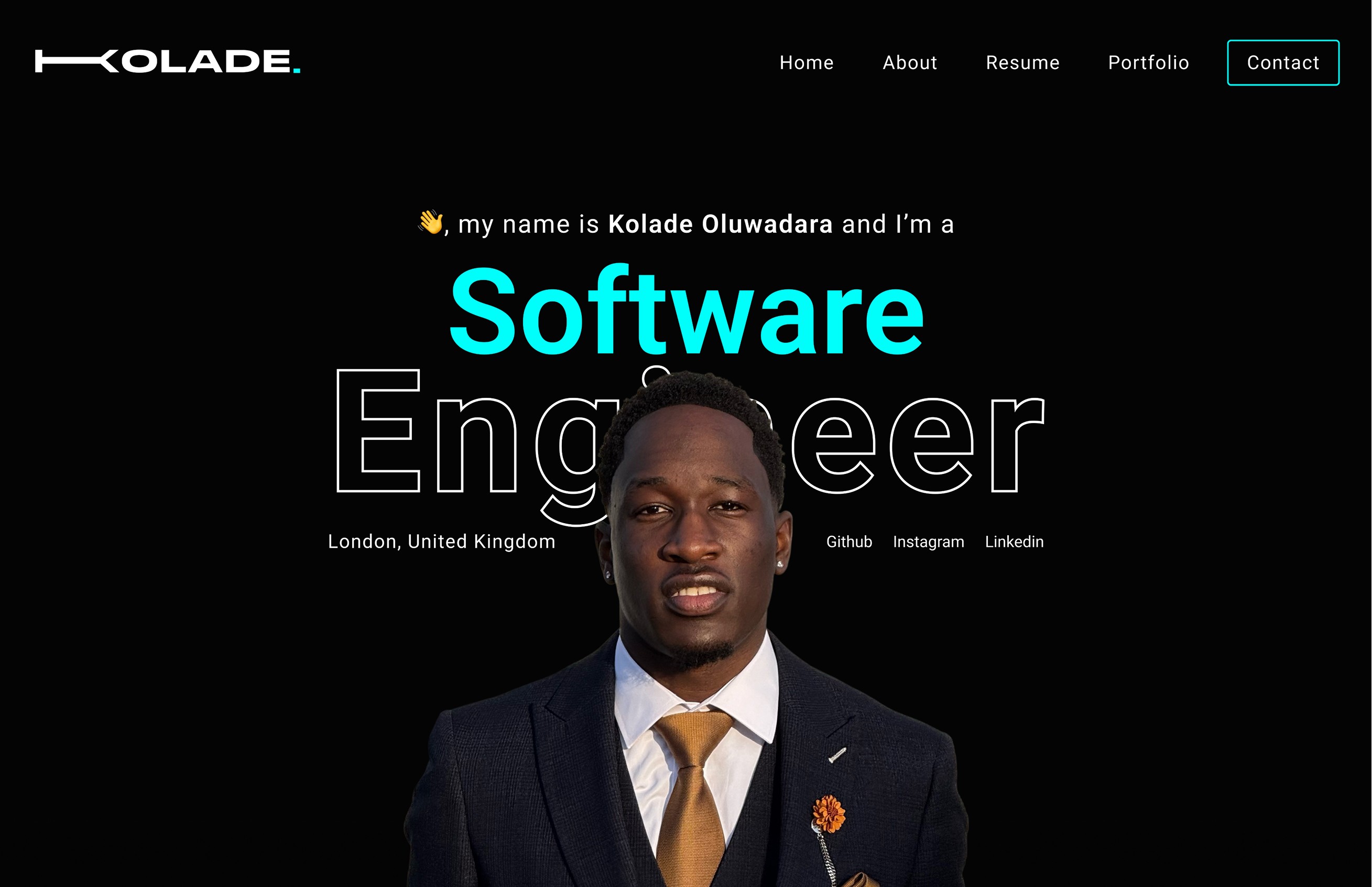 This portfolio website showcases Kolade Oluwadara, a London-based software engineer. It aims to establish a bold, modern digital identity that balances professionalism with personal style, introducing Kolade with confidence.